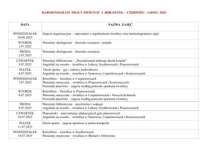 HARMONOGRAM PRACY I GODZINY OTWARCIA ŚWIETLIC I BIBLIOTEK WIEJSKICH – LIPIEC – SIERPIEŃ 2025